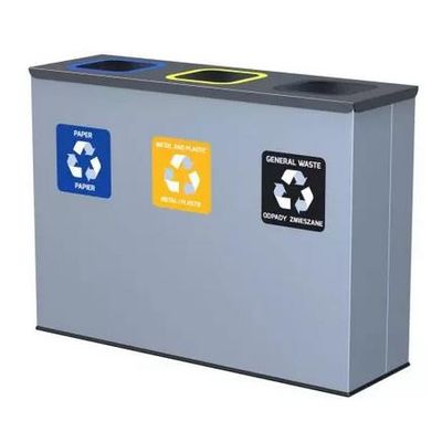 Waste bin, 3 compartment, 3x60L. The 3-chamber waste recycling bin, which helps protect the environment, has been designed for long-term use and easy care. The 3x60 litre waste recycling bin is entirely made of stainless steel, which gives it a beautiful appearance and ensures extreme durability. Its attractive shape and design, which this recycling bin boasts of, ensures a perfect fit to any interior: both at households as well as in industrial spaces.