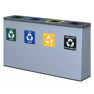 Our 4-chamber waste recycling bin is the perfect bin for waste segregation. Each 60-liter waste recycling bin has a sticker for each type of waste. Each sticker has a distinctive colour and inscription that will facilitate the segregation of waste. The recycling bin can be made of organic steel or powder coated steel. The cover of the 4-chamber waste recycling bin is powder coated, which makes waste segregation easy and hustle-free. The 60-liter waste recycling bin has additional advantages such as the non-slip rubber base and a waste bag holder. Width: is: 121 cm / The height of the bin is: 69 cm. Waste sorting bin, 4 - chamber 4x60L.