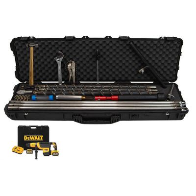 Even easier with reverse augering capabilities and quicker connection. 2" Flighted Auger Kits are equipped to drill access holes up to 9' and collect soil samples into liners using the 1-1/2" X 6" Soil Core Sampler. The male/female Hex Quick Pin connections make adding and disconnecting Flighted Extensions easier than ever before, and they allow for reverse augering! Hex Quick Pin connections also prevent the Flighted Extensions from binding or locking up while augering. A Carbide Tip is available for hard and compacted clay soil conditions. Additional extensions may be added to obtain deeper depths. The Regular Slide Hammer that is included allows you to hammer in your Soil Core Sampler. Slide Hammers can also assist with retrieving your sampler by its reverse hammering capabilities. There are 2" Stainless Steel Flighted Auger Kits available. This kit contains a SDS-Max Rotary Hammer Drill. Flighted Auger Kits can also be operated with certain gas-powered drills.