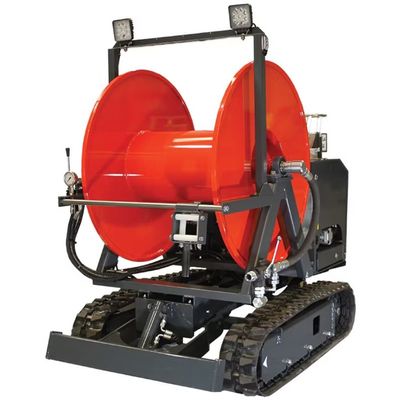 Remote Hose Reel: Versatile, Robust: Tracked 1m Wide Undercarriage, Custom Made Frame Assembly, LED Beacon, 2 x LED Work Lamps, 750KG Excluding Jetting Hose. AG Remote Reels are manufactured to suit requirements in a wide variety of configurations, including tracked, wheeled and dumper arrangements. The unit is ideal for high-pressure jetting in restricted access sites where normal water supply is difficult. This standard remote reel features a one-metre-wide tracked undercarriage, powered by a 19HP diesel engine, with the brake drive driven through a valve chest arrangement. The custom-made frame and hydraulic drive hose reel holds 200 metres of 3/4” jetting hose. The unit is operated via an easy-to-use control panel for reel operation and precision maneuvering. Due to its low ground pressure it is suited for work on sports fields and golf courses.