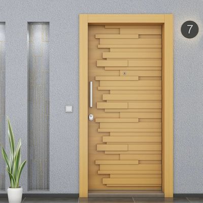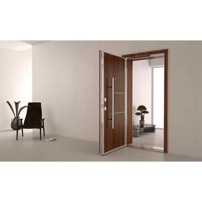 Leaf Front Face : 8mm mdf lam. Leaf Inside Face : 8mm mdf lam. Steel Leaf Frame : Coated with aluminium and stainless steel. Front Frame : Coated with 8mm mdf lam on galvanized steel and aluminium. Inside Frame : Coated with stainless steel on galvanized steel and aluminum. Lock : 14-Point Central Locking System.