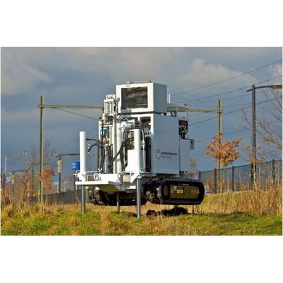The CPT Crawler provides the same high production rates and reliability as the CPT Truck, with the advantage of tracks for better manoeuvrability in rough or soft terrain. The crawler is the only option at sites where the maximum allowed height is limited. Of course a separate carriage is required for transport of the crawler. The twin-cylinder HYSON 200 kN can be built on a 15 tons crawler which is suitable for pushing forces up to 150 kN or on a 20 tons crawler that provides counterforce up to 200 kN. The penetrometer is operated via the touch screen (HMI). The A.P. van den Berg CPT Crawler design can be based on customer specific requirements and/or existing crawler vehicles/chassis.