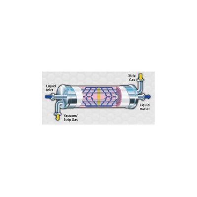 In High Purity/Ultrapure water applications when dissolved carbon dioxide (CO2) or oxygen (O2) is present in the water, a Membrane Contactor is often used for degasification between the RO and the EDI (or DI) to reduce the load on the EDI (or DI). Membrane Contactors are also an alternative to standard Deaerators for removing CO2 and 02 from boiler feedwater. The removal of CO2 and O2 protects boilers from corrosion. A Membrane Contactor uses a hollow fiber membrane where the feed water flows across the outside of the hollow fibers while a vacuum applied to the inside of the fibers. The hydrophobic membrane allows the dissolved gas to pass through the membrane while retaining the water. The vacuum creates the driving force for dissolved gas in the liquid to pass through the membrane pores and be swept away by the vacuum pump.