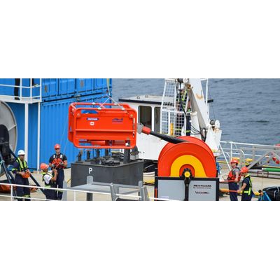 The URO 300 Offshore Oil Skimming System features two recovery modules using RBS TRITON™ technology capable of recovering over 300m³/h. The URO 300 system consists of three major components: the RBS TRITON™ 300 oil skimmer head, a hydraulic power pack, and a floating-hose reel system with integrated crane. The complete system is stored on a compact and standard ISO type 8 ft x 20 ft system base that allows the system to be transported by truck from a warehouse to a vessel of opportunity.