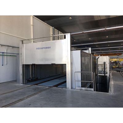 These Aquafrisch equipment allow to verify the tightness of the wagons and locomotives once they are manufactured. The system consists of a mobile gantry that moves longitudinally spraying water on the surface of the train. Parameters such as pressure, flow and number of cycles to perform can be configured based on customer requirements. To ensure a correct check of the tightness, the speed of the arc is regulated by frequency inverters. Since the use of water can be high based on the verification requirements by the buyer of the rolling stock, Aquafrisch includes a water recycling system. The control system has a touch screen for easy and intuitive use.