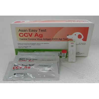 For Detection of Canine Corona virus antigen (CCV Ag). Computerized products code: 22345. Product Cat. Number: AM9145-K. Product Name: Asan Easy Test CCV Ag. Package: 1T x 20/Kit. Storage: 2~30?. Expiration: 24 Months.