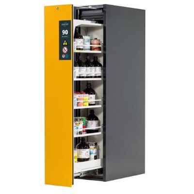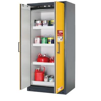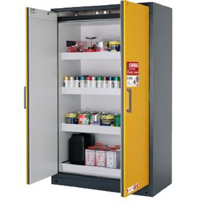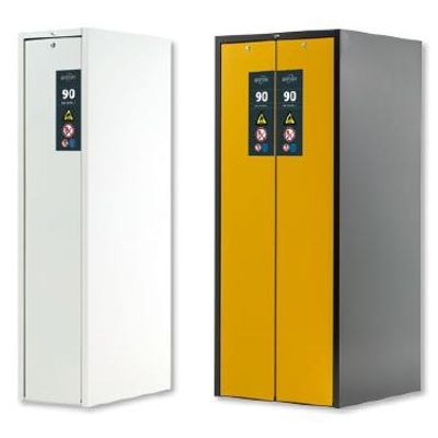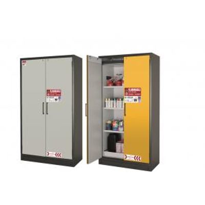 Flammable storage cabinets for high risk areas with extra sturdy construction for the safe storage of flammable hazardous substances. Free standing units with integrated transport base, choice of two door colours and cylinder lock with locking status indicator.