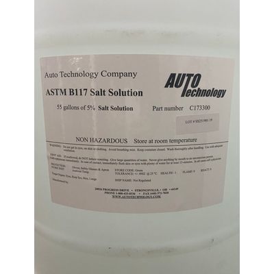 C173300 – 5% Salt Solution – 55 gallon drum -Works with all Harshaw, Engelhard, Atotech USA, Atlas and Auto Technology Company fog and cyclic corrosion test chambers. Test Method/Application: ASTM B 117.