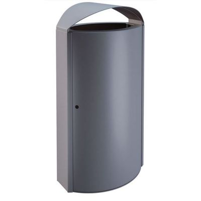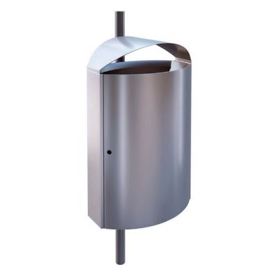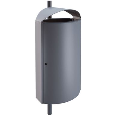 Self-supporting, curved, powder coated galvanized steel outer walls, connected to stable flat side panels. Reinforced door with welded hinges. Two door retention profiles prevent overstretching of the hinges. Doubled cover construction with welded insertion-plates that guide waste into the galvanized inner liner. The inner liner or drip tray is sealed. A U-shaped profile on the back and underneath, for universal attachment to round and square posts, increases stability.