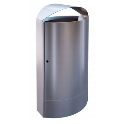 Self-supporting, curved stainless steel outer walls, connected to stable flat side panels. Curved door with recessed lock (a key is supplied with each container). The door retention profile prevents the hinges from overstretching. A curved cover is firmly connected to the structure. The shape of the cover results in reduced height from two sides. A sturdy insertion ring guides waste into the inner liner.