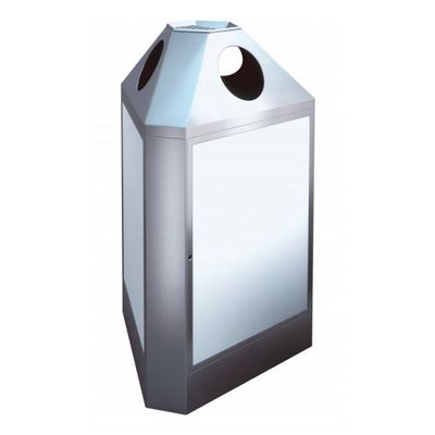 Self-supporting, straight exterior walls incl. rounded corner profiles and a cover construction made of stainless steel, fastened with a galvanized interior construction, provide great stability. The funnel-shaped openings on the top of the container guide the waste into either a bag holder (version 1) or a galvanized inner liner, which also serves as a bag holder (version 2).