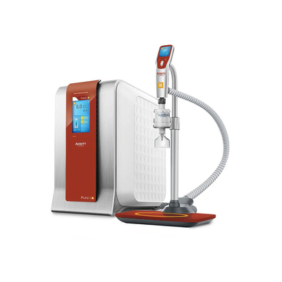 It dispenses up to 2L/min of both Type 3 reverse osmosis water and Type 1 ultrapure water from a flexible dispenser. Real-time water quality and operating conditions are displayed on the dispensing interface. A compact dispensing stand offers true flexibility to users by maximizing bench space and locating the dispenser at the most convenient point of use.