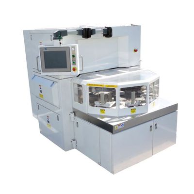 The model 7AA fully-automatic wafer grinder is an automated in-feed grinder capable of grinding wafers ranging from 75 to 150mm in diameter. The 7AA combines proven vertical down-feed grinding technology with force adaptive grinding. The 7AA lowers the diamond wheels onto the wafer limiting the total downforce that can be applied to the wafer to a predetermined maximum. This protects the machine, the diamond wheels, and your valuable product from being overstressed, yet allows the machine to grind at its maximum possible rate. The 7AA also uses closed loop thickness control to reduce thickness errors and eliminate regrinds. Through continuous monitoring the computer determines if the final thickness varies from the target thickness and adjusts the grind spindle position.