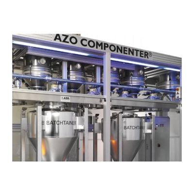 This version of the AZO COMPONENTER® is particularly useful where contamination-free solutions are needed, such as in the pharmaceutical and chemical industries or for raw materials with difficult discharge characteristics. Components included in the recipe are buffered in raw material containers which are docked at a row of container discharge bases and kept free of dust by a patented docking collar; here, they are automatically identified and registered. For reliable discharge and exact dosing, the container discharge stations are equipped with dosing screws. Beneath the discharge bases, a mobile, recipe-controlled floor scale is used to prepare the batch. Atop this scale is an AZO BATCHTAINER® in which frequencycontrolled coarse / fine flow dosing takes place.