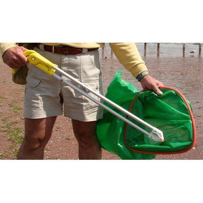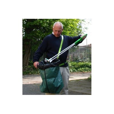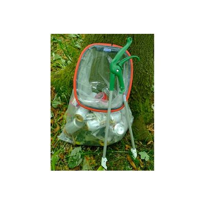 Litter Pick Bag Holder, for fast loading by Litter Plier eliminating the familiar problem of trying to hold open and load a sack. The inset hand hold of the frame provides a comfortable grip even when carrying a fully loaded sack. The bag is firmly trapped onto the frame by a flexible tubular ring. The frame is formed in rigid PVC, the bag retainer tube is thermoplastic rubber. Suitable for bags/sacks with a neck width of 570mm.+, sack change can be effected with ease in less than 30 seconds. To facilitate litter segregation for re-cycling a second smaller bag can be fitted inside the first and stretched across the centre of the opening. As standard: frame colour is black with red or green bag-retainer-tube; white with a green tube is also available. Opening perimeter: 110cm., height 30cm. width 33cm. Weight 350 grammes.