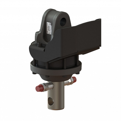 Modification of GR30 rotator, equipped with extra-durable arched hose guard for even better protection of hoses. Upper connection - EYE form factor of the knuckle joint. Lower connection - AXLE form factor, to be built in grapple/tool.