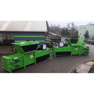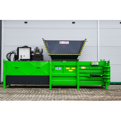 Semi-automatic baler, horizontal press 800 MAX provides a throughput of 2 tons per hours which makes it perfect for waste processing plants. The machine has a crushing force of 75 tons, the knife cutting off the excessive material in the charging chamber, the floor made of wear-resistant steel, a bale full indicator and a three-phase motor with the power of 15 kW. Optionally, the baler may be equipped with additional devices, e.g.: a tippler for 1000 L containers, co-operating conveyor belt, extra security devices, etc. Horizontal binding system makes it perfect for baling plastic PET bottles and aluminum cans. The whole process of baling, apart from binding, takes place in an automatic cycle. The main feature of 800 MAX baler is the possibility of ejecting a single bale due to the use of elongated actuator.