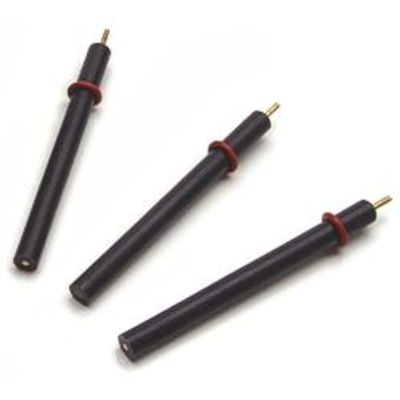 These disk electrodes are small and easy to use. All are manufactured in a solvent-resistant PCTFE plastic body (7.5 cm length x 6.35 mm OD) which is embedded with highly polished disks of various electrode materials (glassy carbon, gold, platinum, palladium, nickel, or silver). There is also an electrode body designed for use with carbon paste (also available from BASi) or new composite materials of your own design and an electrode body designed as a working electrode holder with an alligator clip. A brass rod (1/16”) mounted in the plastic body of the electrode is used to connect these electrodes to an appropriate instrument using either an alligator clip or a 0.060" gold-plated female connector (MF-2004). Each electrode comes with a silicon O-ring which fits snugly on the plastic body. By rolling the O-ring to different positions, you can change the depth of the electrode mounted in an electrochemical cell. Surfaces are polished to a mirror finish and easily maintained with the BASi® PK-4 polishing kit, which is sold separately.