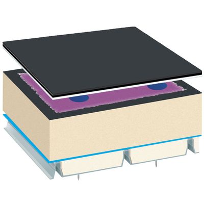 The Profiled PIR Infill Overlay system incorporates a PIR insulation infill that is cut to match profiled sheet metal and roof structures. The system then adds a BauderPIR FA flatboard insulation and a single ply membrane to complete the overlay solution.