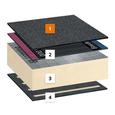 The K4E capping sheet is 4.2 mm SBS modified elastomeric bitumen membrane with a mineral finish that is fully bonded to the specified underlayer.