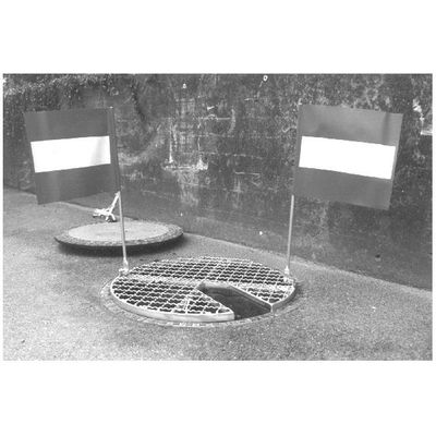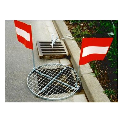Closed, Outside diameter: approx.65.5 cm, resilient up to a maximum of 100 kg, Weight: about 8 kg, Version: steel, galvanized, 8 independent downward movement safeguards in accordance with the UVV, adapt to different sizes of the circular shafts and street gullies.