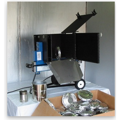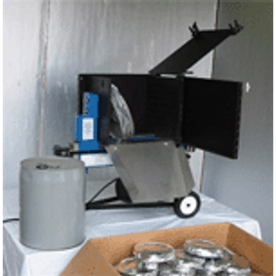 Little Squeeze 4 ton stainless steel chute to direct crushed cans into container.