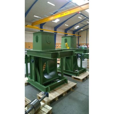 Cooling screw for bitumen: Close-coupled double screw. Gear motor on each screw rotor. The machine is ATEX approved. The gear motors can be controlled individually for moving the screw flights closer together (cleaning function). Complete control system delivered with the screw. The cooling jacket is pressure tested to 6 barG and approved according to the PED directive. The tubes of the screw rotors are supplied with inner tubes for cooling and pressure tested to 6 barG. Supply of water via a turnable coupling. Supply of water via a turnable coupling. Manufactured in AISI-316, 1.4401, screw flights are manufactured in duplex steel, 1.4436. Flights with holes and knodges to avoid blocking of the sticky material. Own manufactured gate valves approved according to ATEX. Complete documentation delivered with the machine including calculations to fulfill the PED directive.