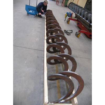 Mixer screw rotor Ø1000: Manufactured in stainless steel 1.4301. Double set of flight with 4 different transportation ways. Welded 100%. Acid pickled after welding. An example of BEMA`s capability to manufacture complicated fight segments.