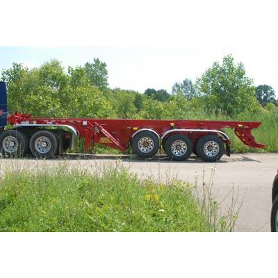 Roll off Trailer that is our most popular unit in Canada. Capable of carrying up to a 38` long container and built with a strong I-beam frame and dual lifting and reeving cylinders, this unit is capable of carrying very heavy loads and meets all Canadian requirements. It comes standard with a stinger tail and air ride suspension with many other options available.