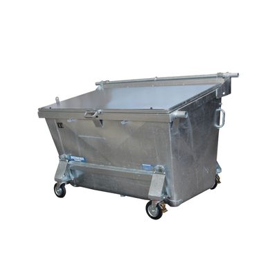 Hot dip galvanized with plastic lid, bottom and sidewalls made of high-grade steel (2 mm), fork-pockets welded, with chain-bolts for chain-loader truck, with castors or landing legs.
