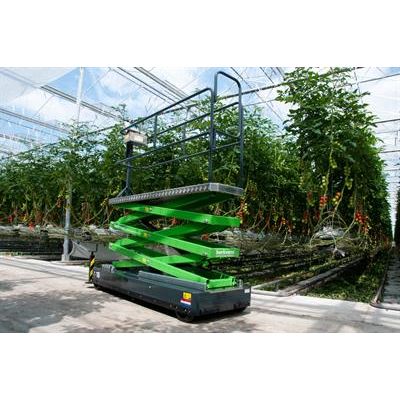 Greenhouse scissorslift for maintenance and crop work. 2 outriggers front side.