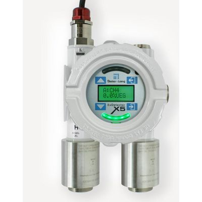 The ExDetector X5 is a gas detector approved for use in explosive environments of ATEX Zones 1 and 2, as well as dust environments of Zones 21 and 22. It measures and displays the current concentrations of explosive or toxic gases and vapors. If required, it can be equipped with two sensor heads simultaneously. This allows the X5 to detect different gases using different measurement principles and sensor technologies at the same time.