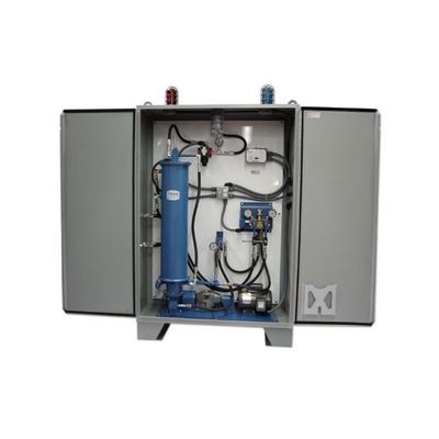 The 39900 Series Area Control Cabinet consists of a DJ45 dual piston motor driven pump, reservoir with high-low reservoir level control valve, DR4 hydraulic reversing valve with manual shutoff valves, SS2200 controller and bulk fill solenoid valve mounted in a freestanding floor mount double door enclosure with green power on light, red fault light and combination motor starter with flange mount disconnect.Being totally enclosed inside a steel cabinet, the components are protected from impact, dust and liquid damage.