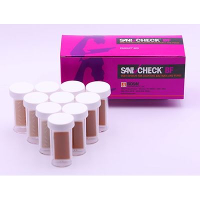 The Sani-Check BF dipslide makes the determination of bacterial and fungal counts fast and simple. Each side of the dipslide is coated with a different medium, one side being selective for fungi and the other for bacteria. Aerobic bacteria will grow on the bacteria side and their growth will be in the form of red dots, also known as colonies, on the surface of the agar. On the side designated for fungi, growth of yeast and mold will generally appear as filamentous structures. The dipslide is compared to a chart in order to get a quantitative interpretation of the results.