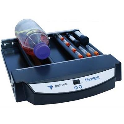 The BioTool FlexiRoll is a compact digital cell roller for use with a variety of bottles, tubes and flasks. Applications include growth and culturing of adherent cells, suspension cells, mixing blood or vacutainer TM tubes, washing nucleic acid blots or performing hybridization protocols. Ideal for use on a benchtop or in a CO2 incubator; can be safely operated in temperatures ranging from 4° - 60°C and atmospheric environments of up to 95% humidity. The FlexiRoll operates from .5 – 80 rpm and offers a timer function when used with the digital remote controller. The six included rollers will accommodate three large (850cm2) roller bottles.