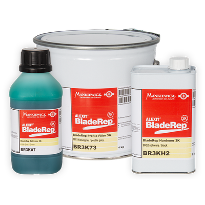 The ALEXIT BladeRep Profile Filler 3K is a specialized, solvent-free, three-component polyurethane filler designed specifically for use in filling and fairing processes on Glass Reinforced Plastic (GRP) substrates. It is engineered to provide an efficient and fast-drying solution, making it an ideal choice for applications requiring rapid turnaround times. The product's formula allows for flexible adjustments to environmental conditions through the addition of a third component. This characteristic ensures optimal performance across various climates and conditions. The product is available in different packaging sizes, including a 20 kg base, 5 kg hardener, and a 0.5 kg activator, catering to different project needs. As part of a complete system for fast and efficient blade repairs, the Profile Filler 3K helps streamline repair processes and enhance application efficiency.
