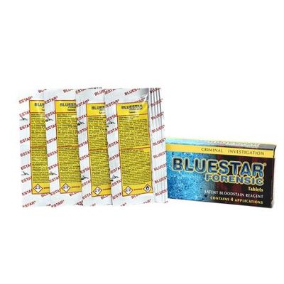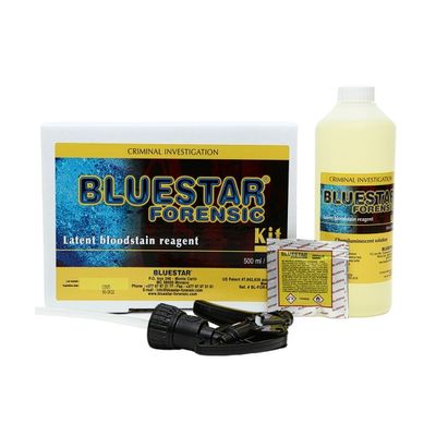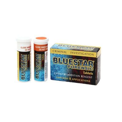 The BLUESTAR FORENSIC KIT provides the crime scene investigator with a complete tool to ascertain the presence of blood, or its possible absence. Ready-to-use : just add the three white tablets to the bottle to obtain a single-use mixture.