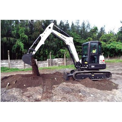 The Bobcat E64 mini excavator works in confined areas without sacrificing digging performance. It features conventional tail swing action with small tail overhang. E64 is available with long arm as standard that offers maximized dig depth, reach and dump height clearance.