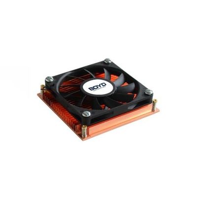 Boyd Fan Heat Sink Assemblies are pre-assembled complete thermal solutions for a variety of board level applications. Save time and space while increasing thermal performance with these compact solutions that are ready to install. Impinging air flow from the fan enables the cool intake air to contact more fin surface area, improving thermal performance. Standard Boyd Fan Heat Sink Assemblies are comprised of a black anodized aluminum heat sink, an Boyd fan, attachment hardware, and thermal interface material. These drop-in solutions provide localized cooling to increase the performance and reliability of your FPGA/BGA device.