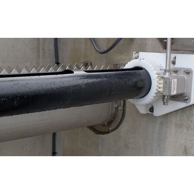 Rotary scum skimming troughs are the most economical method for removing all grease, scum, and other floating materials from the water surface in rectangular clarifiers. Scum troughs can rotate up to 75 degrees both forward and backward to accommodate changes in water level and collect surface material from either side of the trough. Slotted weirs are cut longitudinally along the top of the trough, evenly distributing flow throughout the length of the trough and generating a flushing action to discharge collected material.