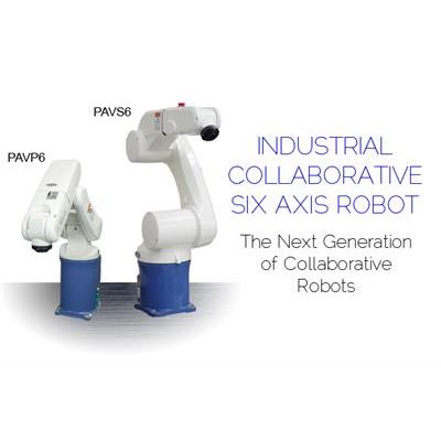 The PAVP6 is a collaborative, tabletop six-axis articulated robot. The intrinsic collaborative capability of this robot permits it to be safely used next to people without requiring safety barriers, which are expensive, consume a great deal of bench/floor space, and obstruct access to equipment. Furthermore, all control electronics and power supplies are built into the robot`s base creating an extremely compact structure that eliminates extra controller cabinets, external harnessing and complicated installations and integrations. This space saving design combined with the robot`s collaborative aspects, low cost, reliable mechanism and excellent position repeatability make the PAVP6 an ideal choice for applications that require 6-axis capabilities and where size, safety and costs are critical.