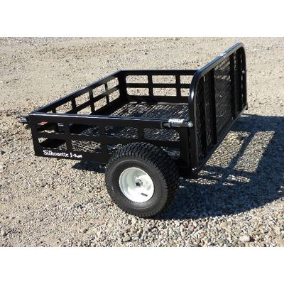 Larger trailer with heavy-duty 9-gauge expanded metal only on bottom. 48″ wide x 61″ long x 9″ high. 18″ x 8.5″ x 8″ pneumatic tires with greaseable needle bearings. Stands on end for easy storage. Rounded tailgate eliminates accidental contact with sharp corners. 1,000-lb capacity.