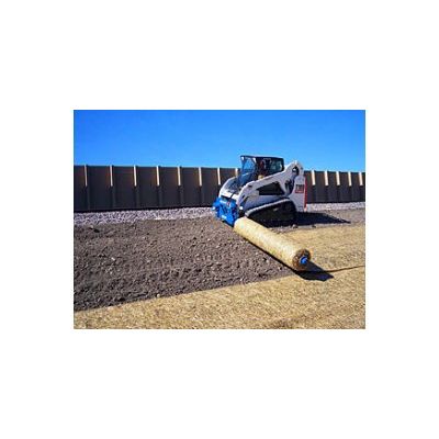 Installing erosion control blankets and matting, this material roller can save hundreds of hours of labor. This productivity tool can also be used for other rolled materials such as non-woven geotextiles, straw blankets and geo-grids. Controlled from the cab, the boom on the material roller can swing 180 degrees to unroll from the right or left side of the skid steer. The boom can also be positioned straight out from the can to unload rolls directly from a trailer which allows the contractor to use larger rolls that could not be handled manually. This process saves users time and ultimately money because of its efficiency.