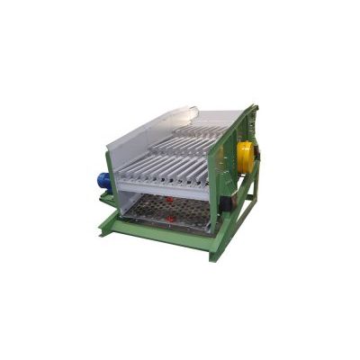 The first screen deck is made of tapered bar sets, the top part made of anti-wear steel. The second deck is of lateral traction type fitted with steel mesh or perforated sheeting. The vibrator is constructed using vibrating-screen bearings, grease lubricated for heavy-duty working conditions, with easily adjustable eccentric masses.
