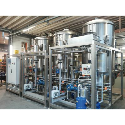 High quality condensate. Energy consumption is reduced to a minimum by using a heat pump in a vacuum. With an absolute pressure of ≈ 33 mbar in the boiling chamber, evaporations occurs at very low temperatures (≈ 35 ºC). Volumes treated 150 – 30,000 litres/day. Volumes processed 150 – 30,000 lt/day.