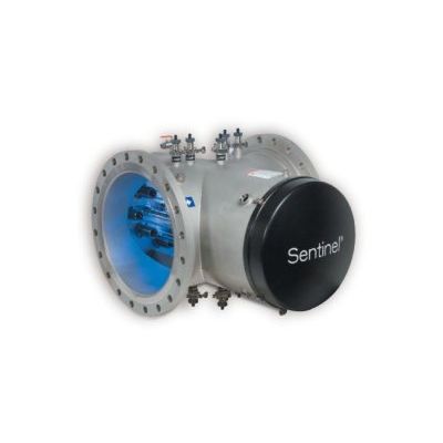 Designed to treat flows up to 27 million gallons per day (100 MLD), the Sentinel` 36 can effectively disinfect drinking water in medium- to large-sized treatment plants. The Sentinel 36 uses medium-pressure lamp technology to achieve greater than 4 log inactivation of Cryptosporidium and similar pathogens in drinking water. Medium-pressure lamp technology allows the Sentinel 36 to be compact with a small footprint. This can provide a significant advantage to water treatment plants looking for a system that can be easily retrofitted into existing treatment systems. The Sentinel 36 outperforms other advanced treatment technologies such as membranes and ozone at a fraction of the cost. The Sentinel 36 system features include independent, third-party-certified UV intensity sensors to assure accurate delivery of UV dose, an automatic quartz sleeve cleaning system, and a fully automated control system.