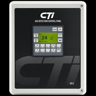 Two channel controller with 4/20 mA inputs for gas detectors; for engine rooms and other 2 channel applications. Two Channel controller for gas detectors of various target gases and ranges. Includes: graphic LCD display, six 10A relay outputs, event logging, dual adjustable setpoints per channel, discrete analog outputs, and power supply. System configuration through user friendly menu-driven LCD operator interface. Weatherproof NEMA 4X fiberglass enclosure safe for outdoors and wash-down areas. six onboard relays standard. Alarm Log records and stores every event. Industry standard linear 4/20 mA input. Simple menu-driven programming through the LCD operator interface. Power supply can also drive external horn/strobes. Watertight enclosure designed for washdown areas and outdoors. Configurable for CTI sensor line and any other 4/20 mA gas sensor. Horn relay silenceable from front-panel Silence key.