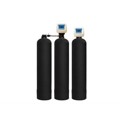 Natural oxidation removes iron, manganese and hydrogen sulfide without chemicals, air pumps or a venturi. Low maintenance two tank system. Regenerates less frequently than traditional iron filters using up to 50% less water than manganese greensand filters. NSF Certified electronic control valve. NSF Certified fibreglass pressure tanks. Meter Immediate, Meter Delayed, Meter with Day Override, Vacation and Calendar Clock mode. Adjustable cycle times. Unique bypass with an integrated space saving turbine meter and sample port on the inlet. One-piece design avoids meter jamming. Time saving quick connect fittings on bypass. Quick connect drain line o-ring eliminates need for Teflon. Power cord even has quick connect for easy valve spin on. Hose clamp and 10’ of drain tubing included.