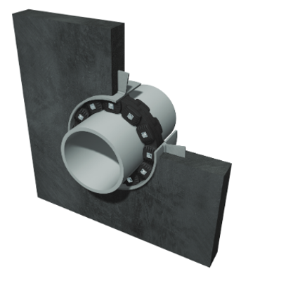 Designed for field installations where the carrier pipe has been installed in a casing. Involves simply wrapping the seal around the carrier pipe and casing; then compressing the adhesive strips together for a seal. Installation is completed when the stainless steel banding is installed and tightened.