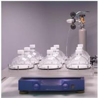 With 22, 33 or 45 parallel detachable HD10 cultivators. Connectable to CellDEG Growth-Control-Unit. Equal growth conditions, no adjustment of bubble-rates. For screening experiments requiring low sample volume and high sample numbers. Seal and attachment by exchangeable silicone moldings. Convenient handling of many parallels in combination with CellDEG HRTT-Sensor. Best with orbital shakers (stroke: 5-15mm at 200-350 rpm).